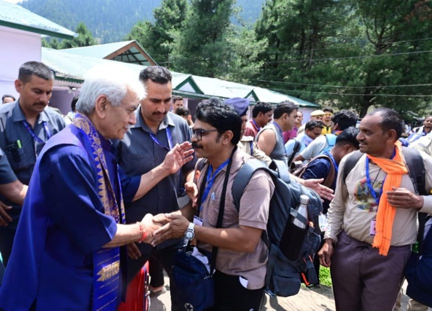 Lieutenant Governor Shri Manoj Sinha today visited the Nunwan base camp in Pahalgam to review the ongoing arrangements for the Amarnath Yatra 2025. During his visit, the LG interacted with pilgrims, service providers, langar sevadars, sanitation workers, and officials from the civil administration and security agencies.