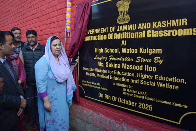 Kulgam, Oct 10: In a significant step towards promoting girls’ education in Kulgam district, Minister Sakeena Itoo on Friday inaugurated a 100-bedded Kasturba Gandhi Balika Vidyalaya (KGBV) girls’ hostel at D.H. Pora. The hostel, constructed at a cost of ₹2.85 crore, aims to provide safe accommodation and better educational facilities to Scheduled Tribe (ST) and underprivileged girls of the region.