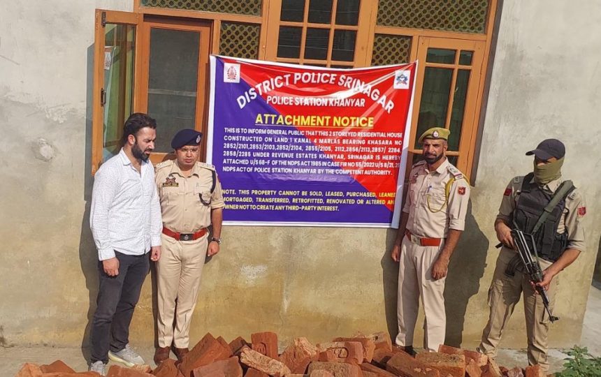 Srinagar, July 21: In a major action against drug trafficking, Srinagar Police has attached property worth ₹1.5 crore under the NDPS Act in Khanyar. The seized assets include a two-storeyed house and over one kanal of land in Budoo Bagh, linked to Suhail Ahmed Bhat, a known drug peddler.